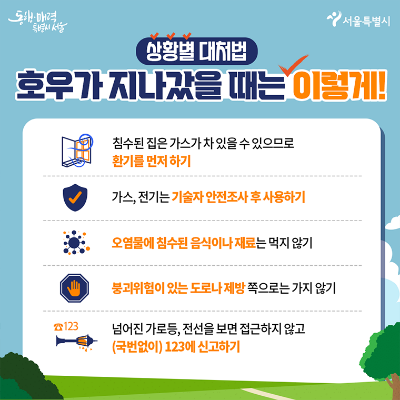 하수구와 집 주변 배수구를 점검하고, 비가 오기 전 하천·지하공간 등에 있는 차를 높은 곳으로 이동해 두도록 한다.