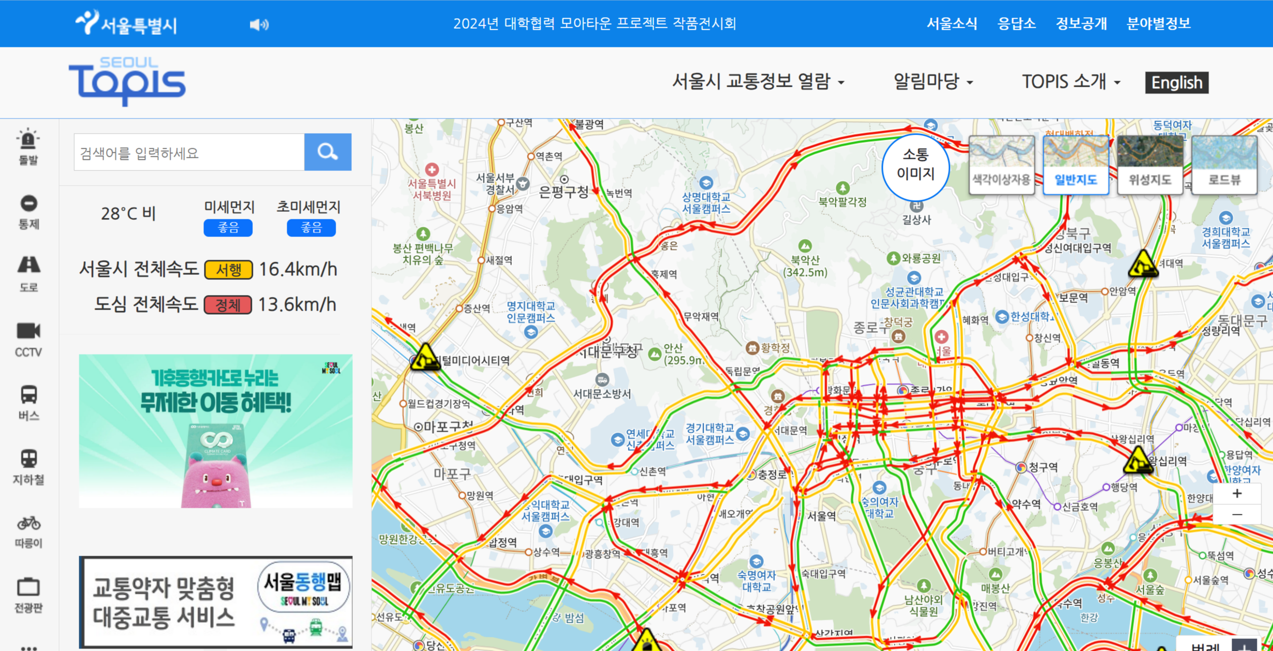 서울시는 교통 정보를 제공하는 전용 앱과 홈페이지를 운영하고 있어요. 이를 통해 시위·집로 인한 교통 혼잡 정보를 실시간으로 확인할 수 있답니다. 외국인을 위해서 영어로 번역이 됩니다.
