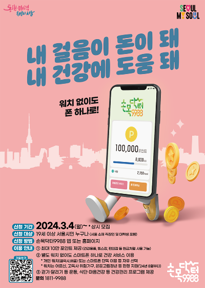 '손목닥터9988'은 서울시에서 제공하는 건강관리 서비스입니다. 19세 이상 서울시민 누구나 참여할 수 있는 프로그램으로, 하루 8,000보 이상 걸으면 200포인트를 적립할 수 있고, 이 외에도 식단 및 생활습관을 입력하면 포인트가 쌓이며, 획득한 포인트는 서울페이로 전환해 병원, 편의점 등에서 현금처럼 사용할 수 있습니다.