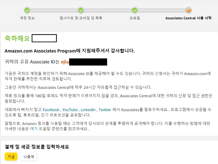 아직 결제 및 세금 정보를 입력하지 않았습니다. 또한, 가입 과정 중에 '제휴 링크를 통해 180일 후에도 적격 판매가 이루어지지 않을 경우 자격이 철회됩니다.'라는 내용이 있었습니다. 이는 제 아이디를 통해 주문이 없으면 자격이 박탈될 수 있다는 의미입니다.