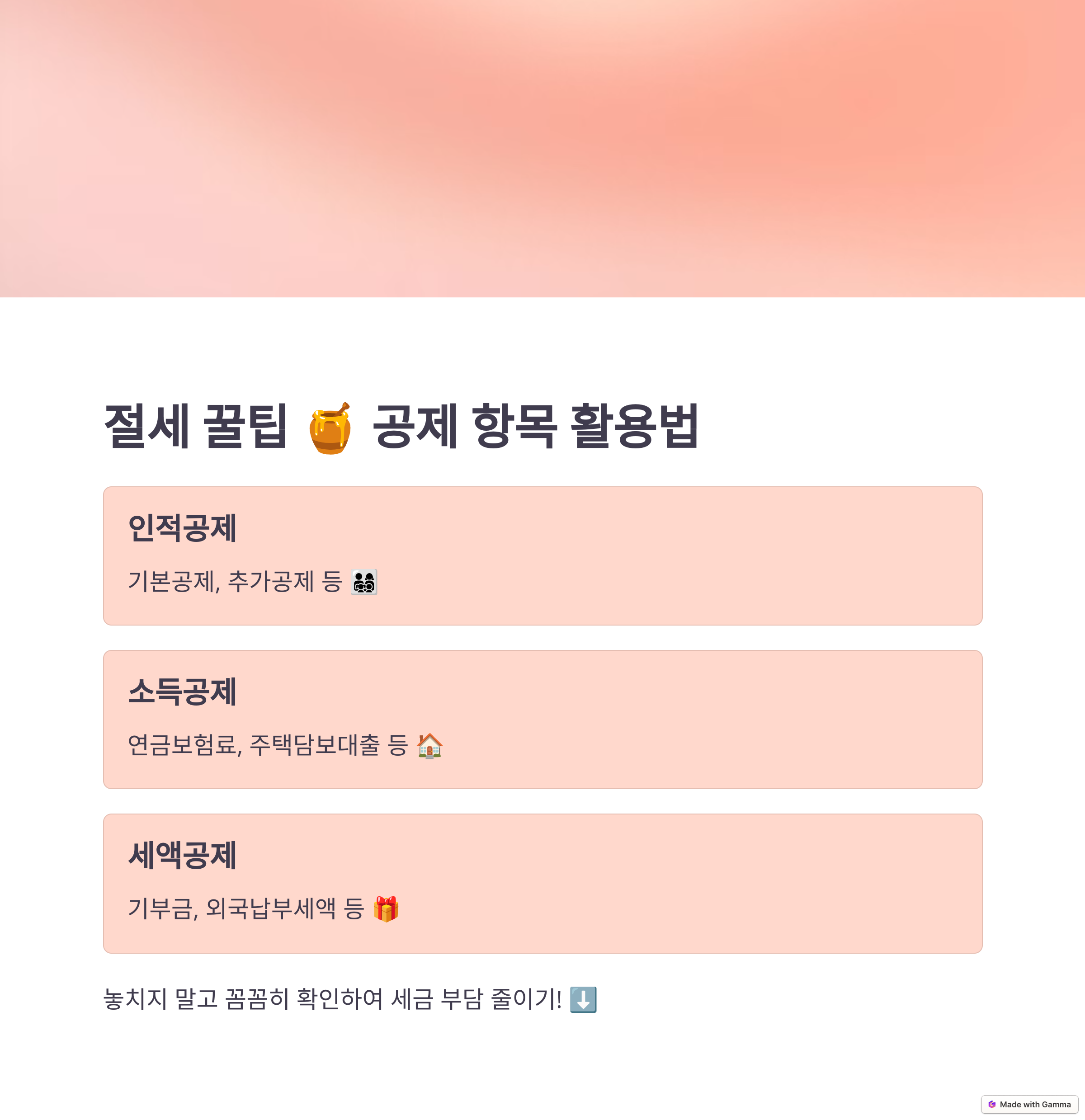 - ✔️ 공제 항목은 빠짐없이 증빙 준비 (기부금, 연금저축, 의료비 등)