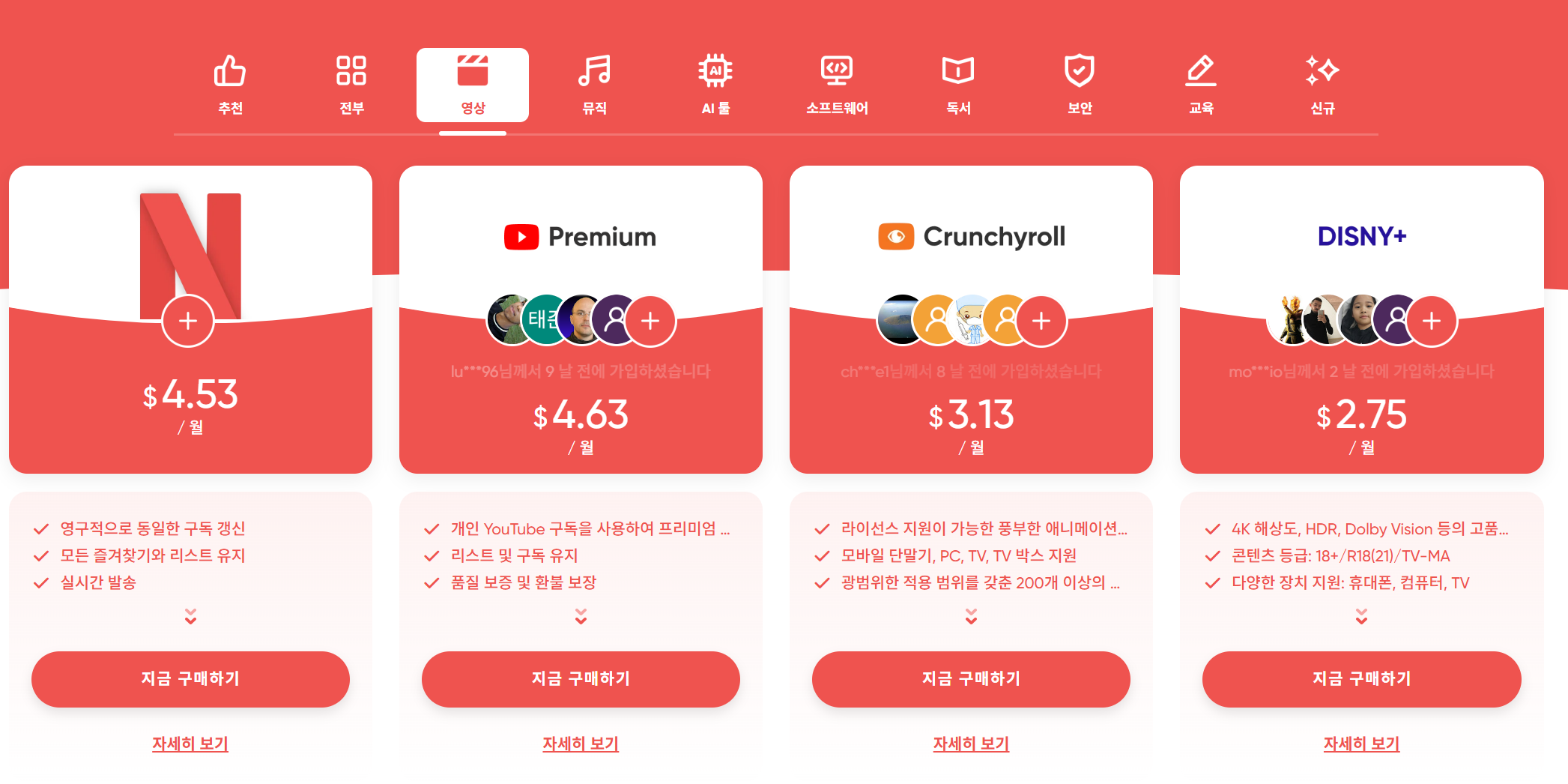 | 넷플릭스 프리미엄 | ₩17,000 | 약 ₩6,700 (환율 기준) |