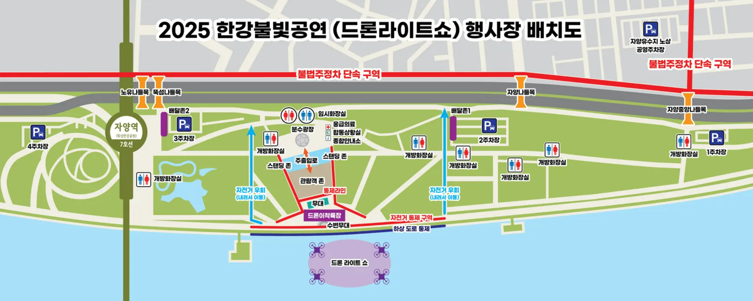 - 🚗 주차 제한 안내: 뚝섬한강공원 3, 4주차장은 드론쇼 종료 직후인 21:30까지 출차 제한이 있을 수 있습니다.