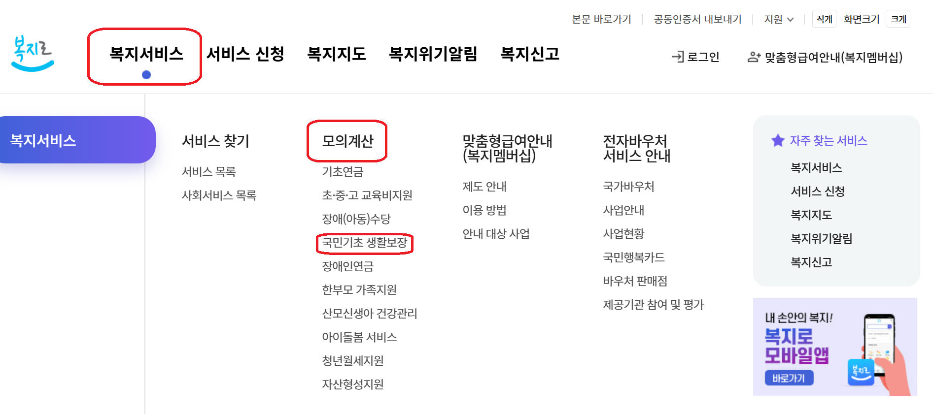 복지로 홈페이지나 주민센터에서 본인의 소득 및 재산 기준으로 확인 가능합니다.
