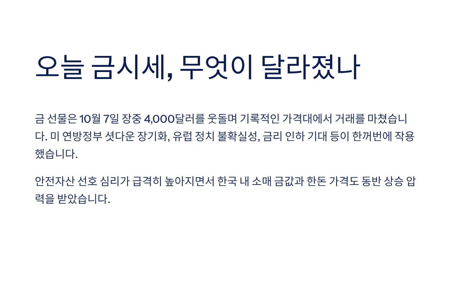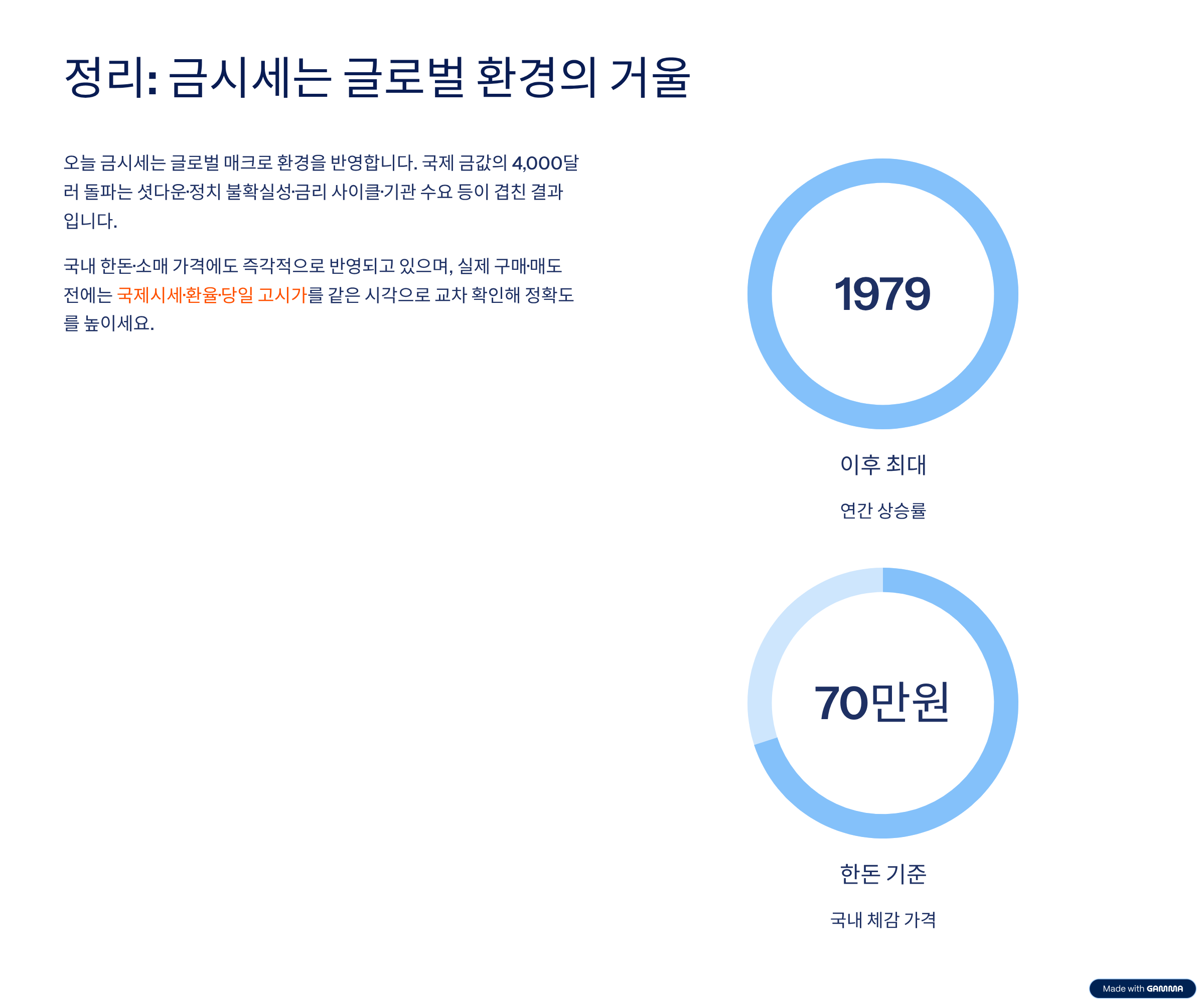 오늘 금시세는 글로벌 매크로 환경의 거울입니다. 국제 금값의 4,000달러 돌파는 셧다운·정치 불확실성·금리 사이클·기관 수요 등이 겹친 결과로, 국내 한돈·소매 가격에도 즉각적으로 반영되고 있습니다. 실제 구매·매도 전에는 국제시세·환율·당일 고시가를 같은 시각으로 교차 확인해 정확도를 높이세요.