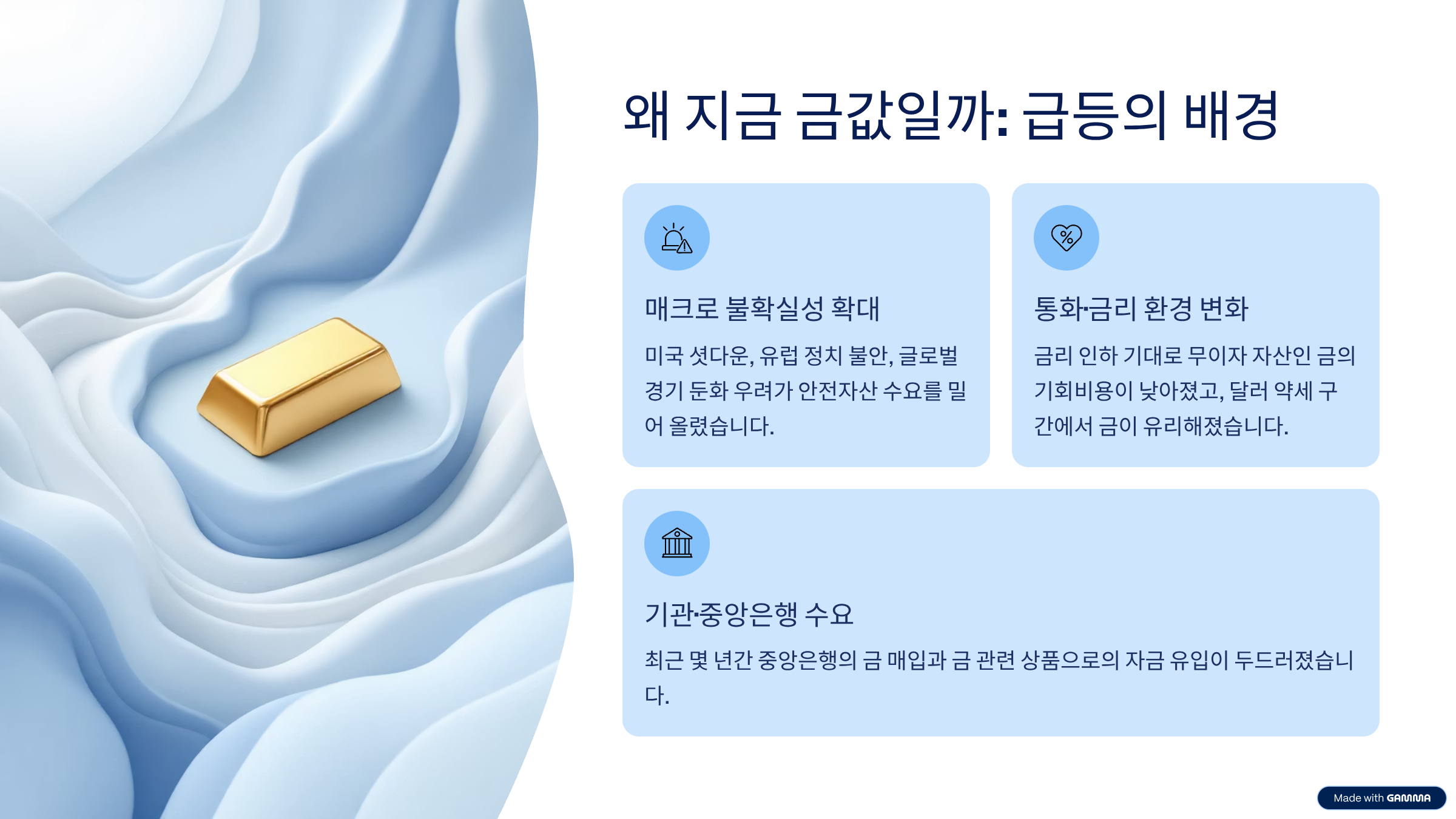 올해 금값 강세의 핵심은 세 가지 축으로 요약됩니다.