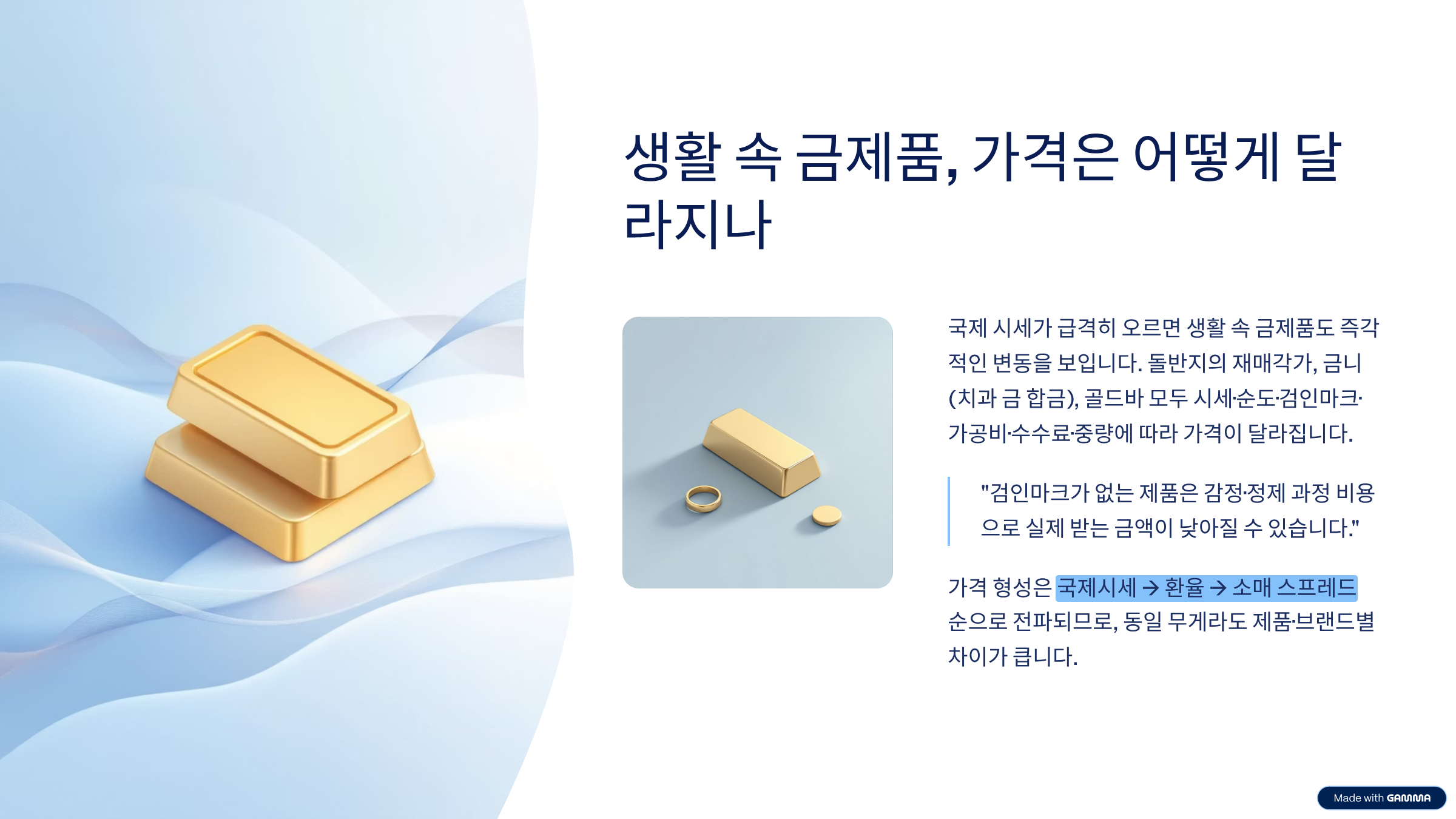 특히 검인마크가 없는 제품은 감정·정제 과정 비용으로 실제 받는 금액이 낮아질 수 있습니다. 가격 형성은 “국제시세 → 환율 → 소매 스프레드” 순으로 전파되므로, 동일 무게라도 제품·브랜드별 차이가 큽니다.