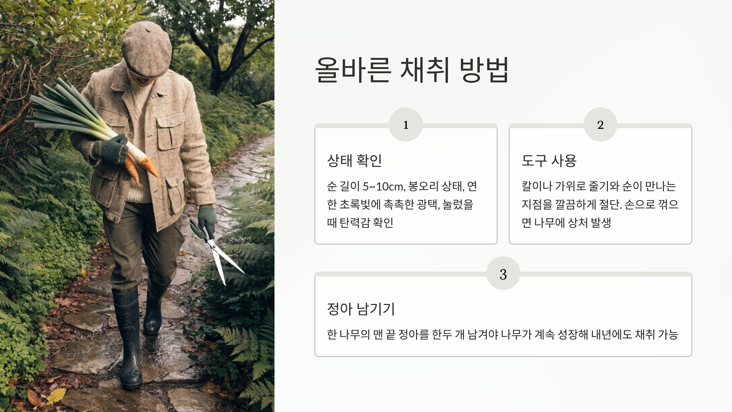 올바른 채취 방법 — 나무도 지키고 맛도 살리고