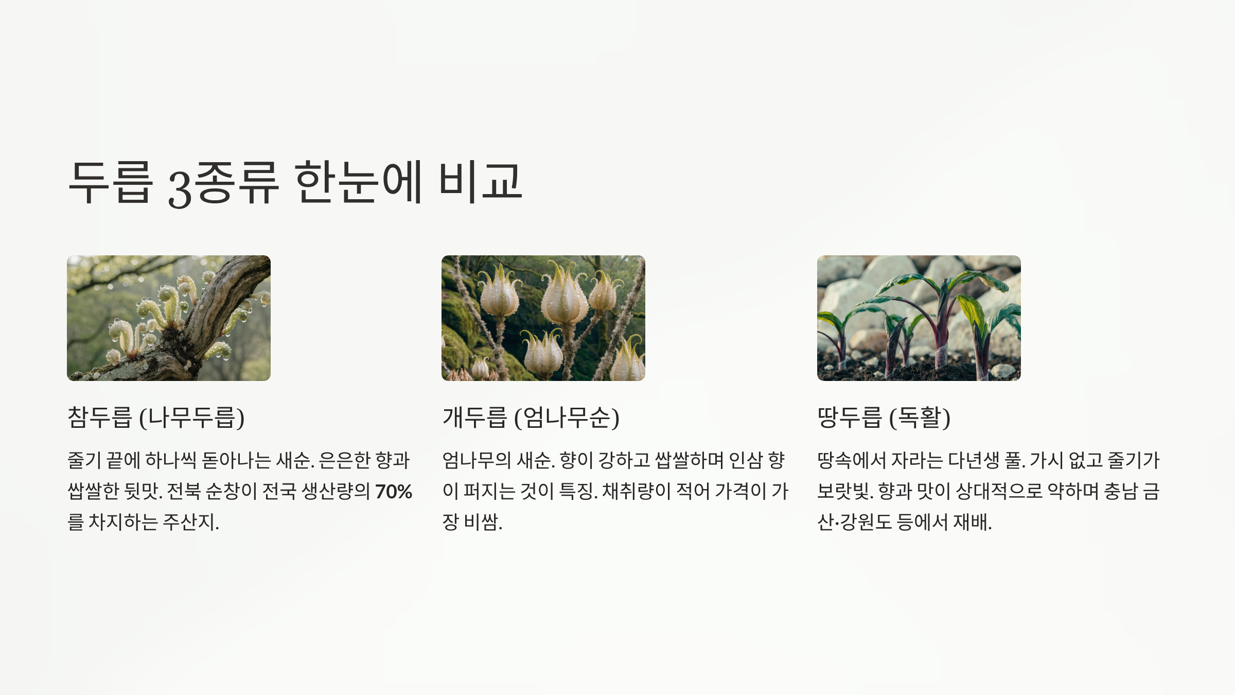 두릅은 나무에서 나는 참두릅·개두릅과 땅에서 자라는 땅두릅으로 크게 나뉘며, 각각 식물 종류, 생김새, 맛이 모두 다릅니다. 재배와 수확이 까다로워 수량이 적은 만큼 가격도 높고, 시장에서 귀하게 취급됩니다.