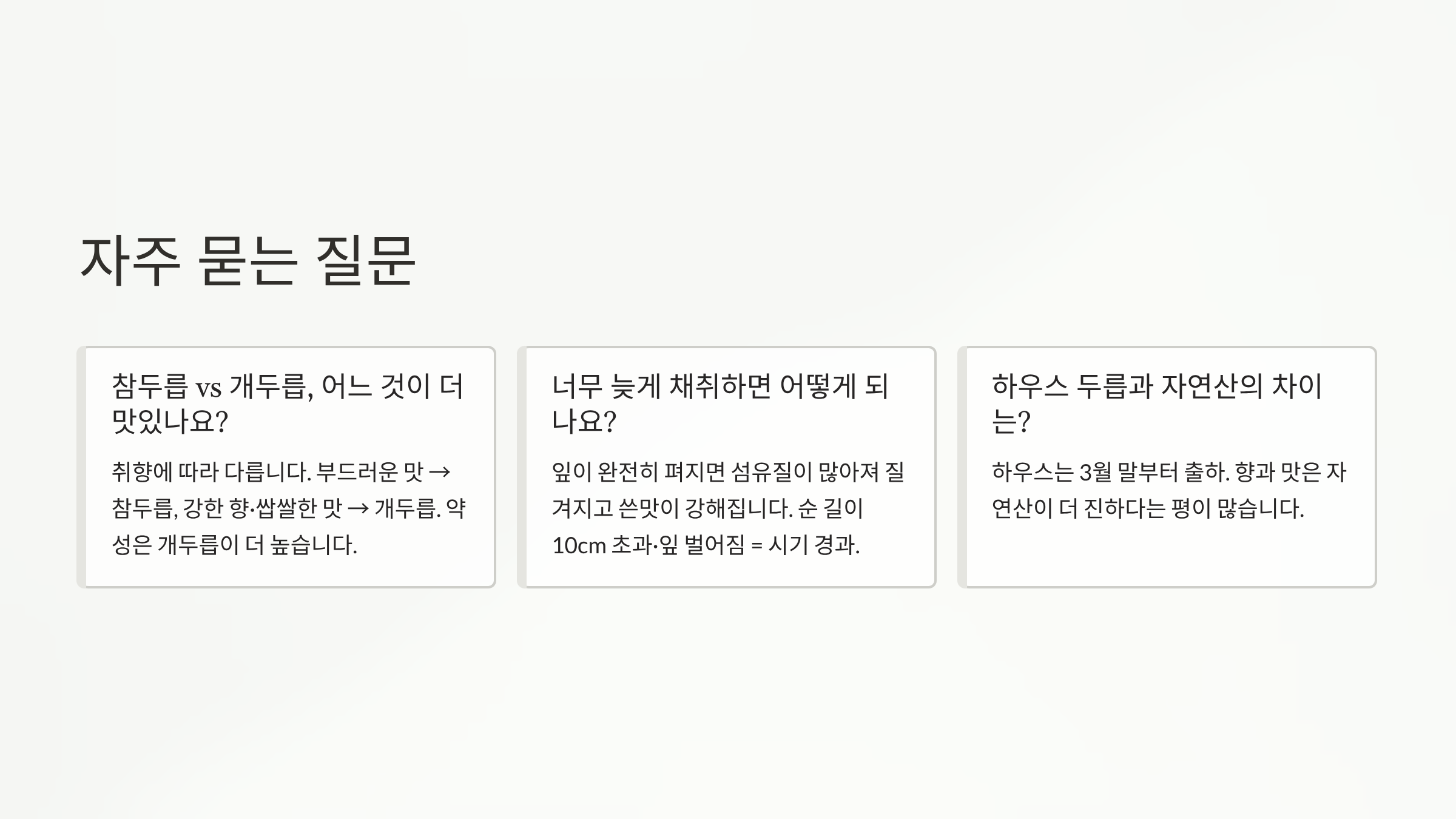 A. 잎이 완전히 펴지면 섬유질이 많아져 질겨지고 쓴맛이 강해집니다. 순 길이가 10cm를 넘어 잎이 벌어지기 시작했다면 채취 시기가 지난 것으로 보는 것이 좋습니다.