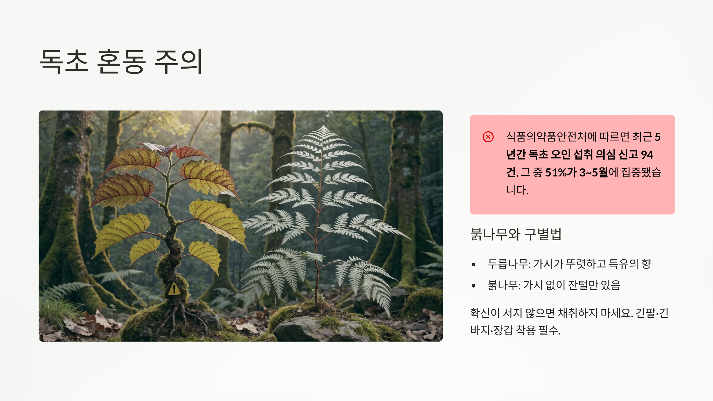야생 채취 시 독초와 혼동하는 사고가 매년 발생합니다. 식품의약품안전처 집계에 따르면 최근 5년간 독초 오인 섭취 의심 신고가 94건에 달했으며, 신고 건수의 51%가 3~5월에 집중됐습니다.