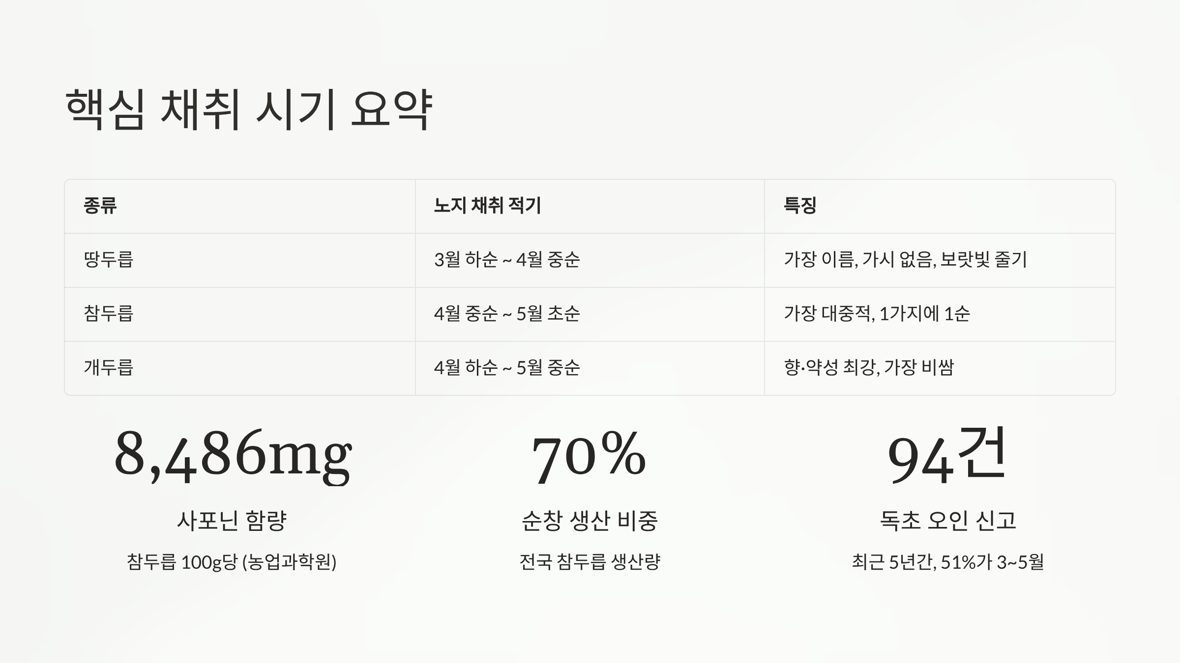 | 종류 | 노지 채취 적기 | 특징 |