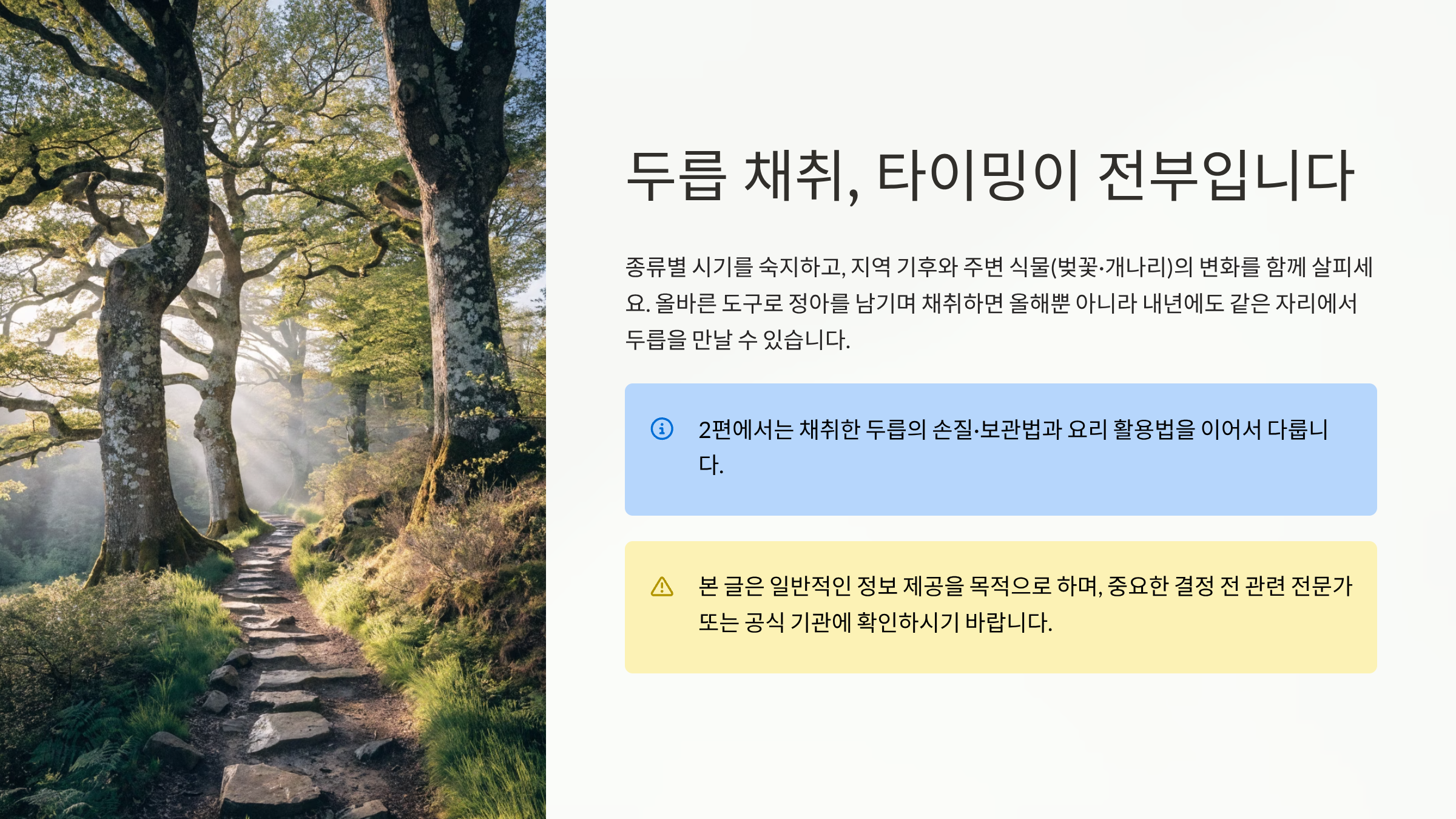 두릅 채취는 타이밍이 전부입니다. 종류별 시기를 숙지하고, 지역 기후와 주변 식물의 변화를 함께 살피는 것이 가장 정확한 방법입니다. 올바른 도구로 나무에 무리를 주지 않으며 채취하면, 올해뿐 아니라 내년에도 같은 자리에서 두릅을 만날 수 있습니다. 2편에서는 채취한 두릅을 오래 신선하게 유지하는 손질·보관법과 요리 활용법을 이어서 다룹니다.