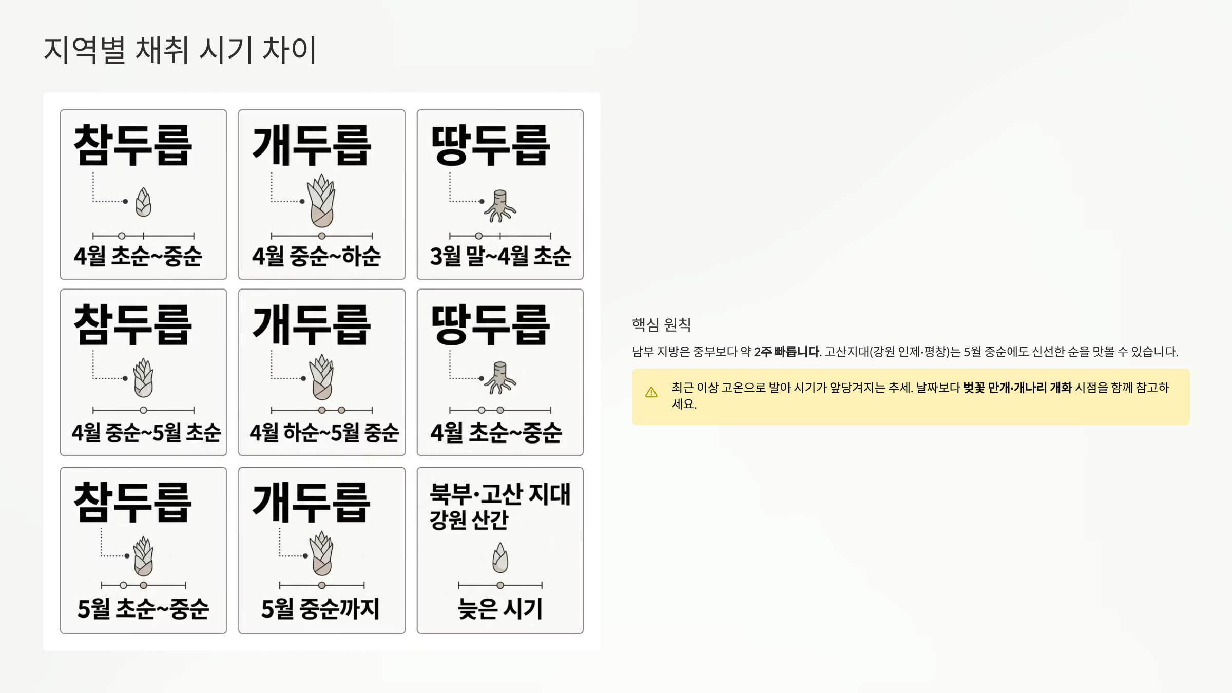 지역별 채취 시기 — 같은 날이어도 지역마다 다르다