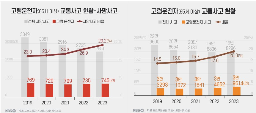작년 한 해 동안 전체 19만 8,296건의 교통사고 중 고령 운전자가 일으킨 사고는 무려 39,614건이나 됐습니다. 이는 전체 사고 중 약 5건 중 1건이 고령 운전자로 인한 사고라는 뜻입니다. 또한, 전체 교통사고 중 사망 사고 비율도 2019년 23%에서 2022년에는 29.2%로 크게 늘어났습니다. 이 통계에는 고령 운전자가 사고로 인해 본인이 사망한 경우도 포함됩니다.